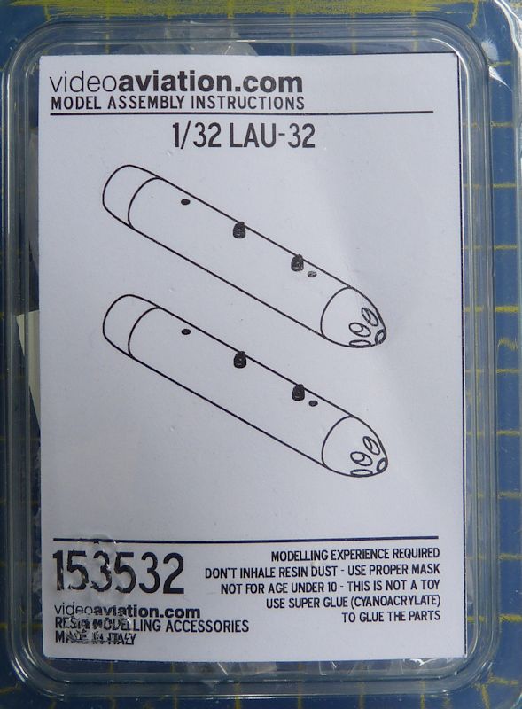 Bausatz: Der neue Kleinserienherrsteller Videoaviation aus Italien konzentriert sich speziell auf den Werkstoff Resin. Wie der Name Aviation schon sagt deckt das Zubehör, wie der Lau-32 Mehrfachraketenbehältern (Gondel), den Flugzeugbereich ab.