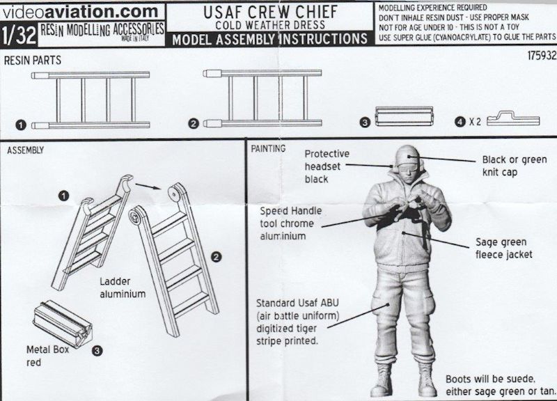 Der Figurensatz enthält einen Wartungsmechaniker der US Air Force. Angezogen in Wärmender Kleidung ist die Figur ansprechend modelliert. Auch die Detaillierung ist sehr ansprechend. Als Zugabe ist eine Klappleiter, eine Werkzeugkiste und ein Schraubenschlüssel beigelegt. Angüsse sind wie üblich zu entfernen. Der Zusammenbau der Figur und der Ausrüstungsgegenstände sollte auch den Anfänger vor keine größeren Probleme stellen. Eine Kurzanleitung mit Farbangaben liegt bei.