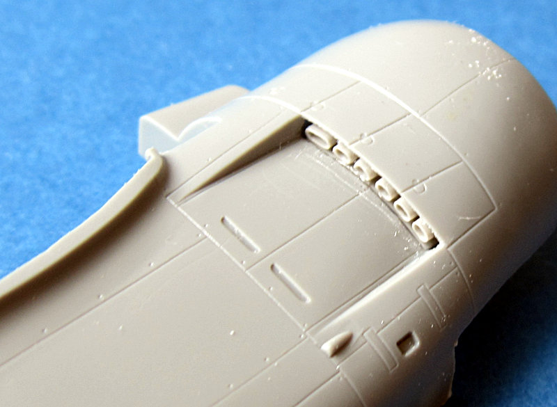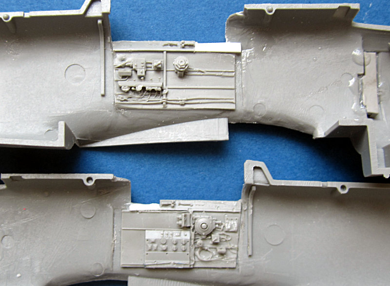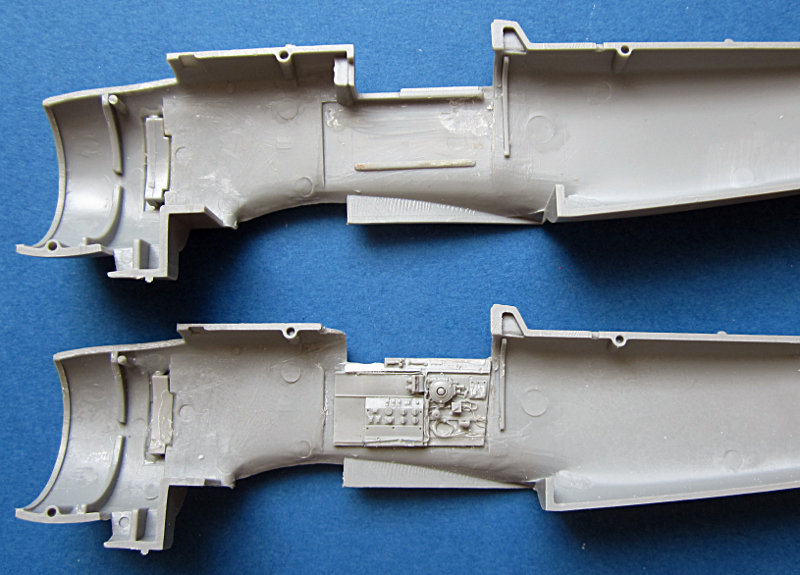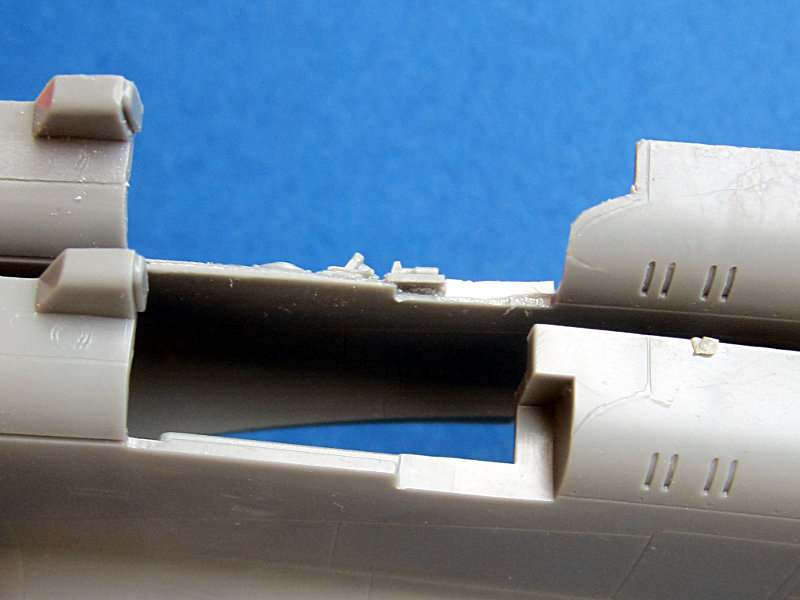 Wegen meiner bekannten Abneigung gegen Cockpits und der anspruchsvollen Einpassung älterer Aires-Sets, habe ich mit den Auspuffstutzen begonnen. Zunächst habe ich die Rumpfteile in diesem Bereich etwas ausgedünnt und dann die Quickboost Teile verklebt. Das Foto zeigt den Unterschied zwischen den Plastik- und Resinteilen.