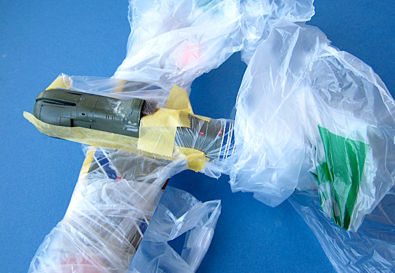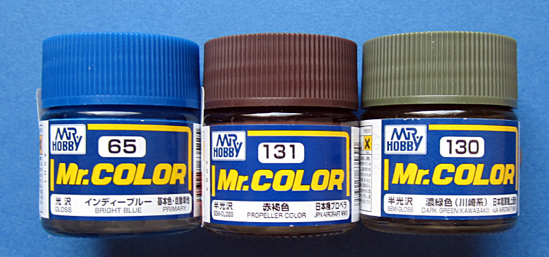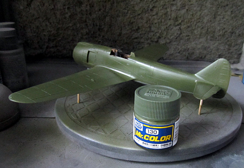 Die Lackierung wollte ich mit dekantiertem Tamiya AS12 Spray für die Unterseite und Gunze Kawasaki Grün für die Oberseite ausgeführt. Wie schon angemerkt ist ein olivgrüner bis olivbrauner Anstrich wahrscheinlich korrekt, aber mir gefällt dieser Grünton für das Modell. Weiterhin hatte ich Propellerbraun und ein tiefes Blau (gemäß Bauanleitung) für die eventuelle Korrektur der blauen Streifen und den Spinner erworben. Dies alles sind Enamel Farben, weshalb ich auf die Verwendung einer Acryl-Sperrschicht vor dem Altern denken muss.