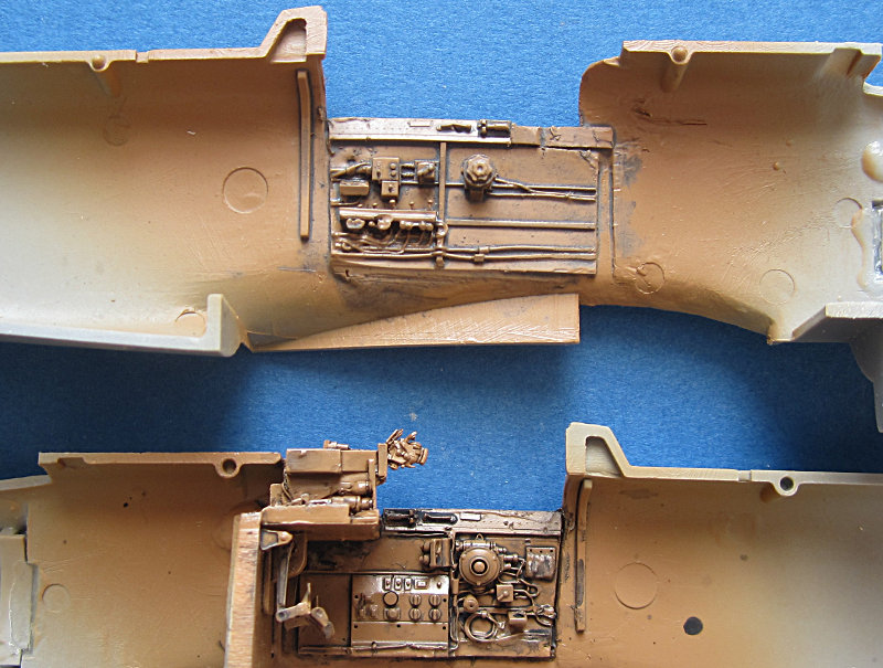 Nachdem ich noch ein paar Nacharbeiten für die perfekte Passung der MG-Instrumentenbrett- Einheit vorgenommen hatte, wurden die letzten Kleinteile am Cockpitboden befestigt und das ganze mit Gunze RLM 79 koloriert. Die in Cosford stehende Ki 100 ist im Cockpit in Außenfarbe grün lackiert, was sehr wahrscheinlich auch für die Ki 100 von Yohei Hinoki korrekt wäre. Ich hab mich hier einfach nicht genügend informiert, auch wenn es für frühe Ki 100 sicher auch für diesen braunen Farbton Argumente gäbe. Jedenfalls bekam das falsche Braun ein erstes Wash um die Details zu betonen. Auf Fotos sieht dies meist nicht so schön aus, aber ich baue eher für die Vitrine als für Fotos – und da braucht man eben etwas mehr Kontrast.