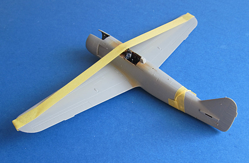 Im Laufe des Baus hat sich dann in meinem damaligen Aeroscale Thread noch ein bekannter "Troll" gemeldet und auf die gebogene "in Flugrichtung" linke Tragfläche hingewiesen. Dies scheint ein Konstruktions- oder Formfehler von Hasegawa zu sein, denn er tritt bei allen meine Bausätzen auf. Trotz meiner Vorbehalte gegenüber den Motiven der Person, entsprach der Fehler den Tatsachen und schweren Herzens habe ich mich zur Korrektur entschlossen.