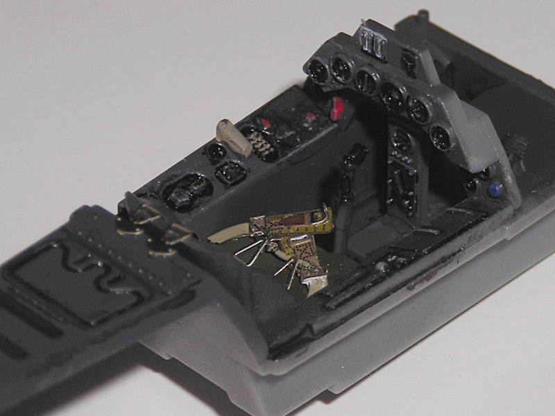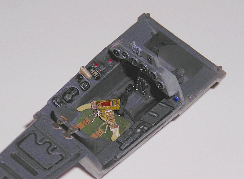 Den Hasegawabausatz habe ich schon vor einiger Zeit vorgestellt (Kitreport). Bis auf einige Kleinigkeiten gibt es nichts daran zu bemängeln, und der Bau kann zügig voranschreiten. Los geht es wie immer mit dem Cockpit, das ich mit farbig bedrückten Fotoätz-Gurten von Eduard aufgewertet habe. Dann konnte auch schon der Rumpf geschlossen und das Cockpit montiert werden. Am Heck gibt es rechts und links in Höhe der Aufnahme des Spornradbauteils leichte Sinkstellen, die etwas ausgeglichen werden sollten (spachteln und schleifen). Wenn man schon dabei ist, kann man die im Kitreport erwähnten Einsinkungen an der Leitwerksspitze einebnen und diese montieren und anpassen (nur etwas schleifen).