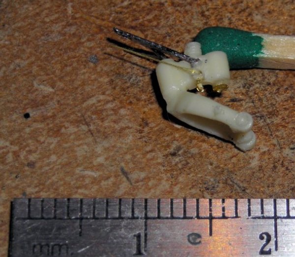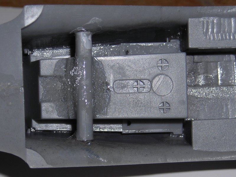 Während der Trocknungszeit des Spachtels habe ich die Flügelbaugruppe nach Bauanleitung komplettiert. Bei der Passprobe zwischen Rumpf und Flügel zeigte sich rechts und links ein Spalt von etwa 1/2 mm. Um diesen zu verringern habe ich einen kleinen Spreizer in den Rumpf eingebaut ... hier kam ich mit relativ geringem Druck aus, da die Lücke ja nicht riesig war. So konnte ich auch vermeiden, die Form des Rumpfes zu verändern und verringerte die Gefahr von Belastungsbrüchen.