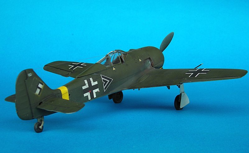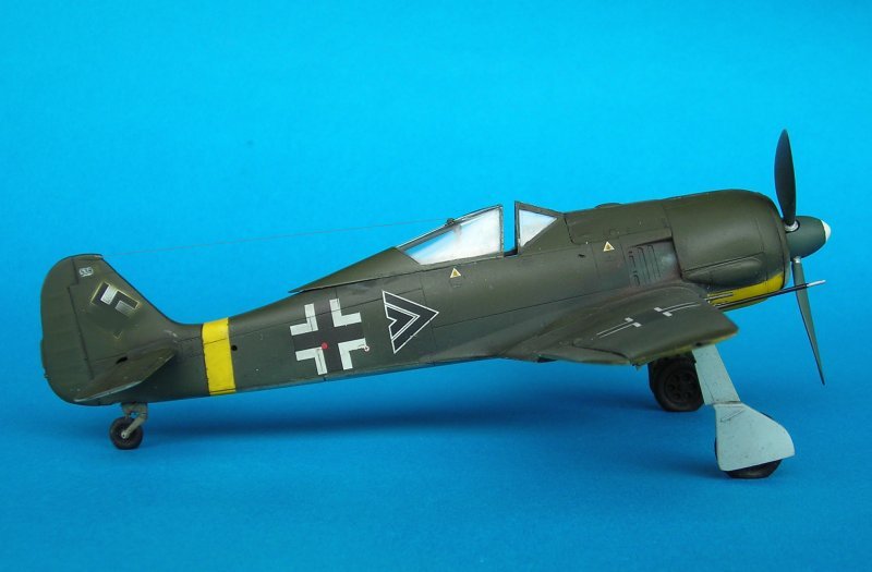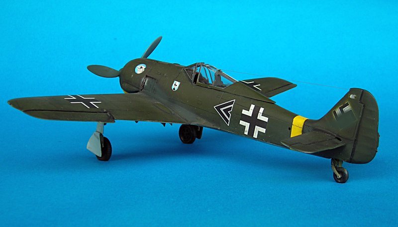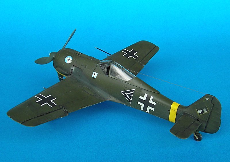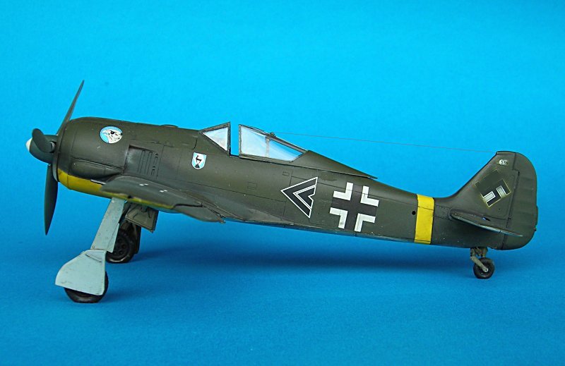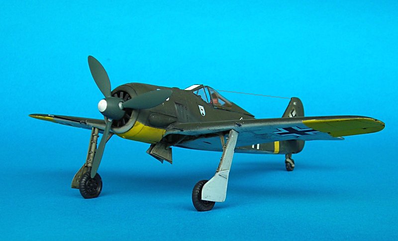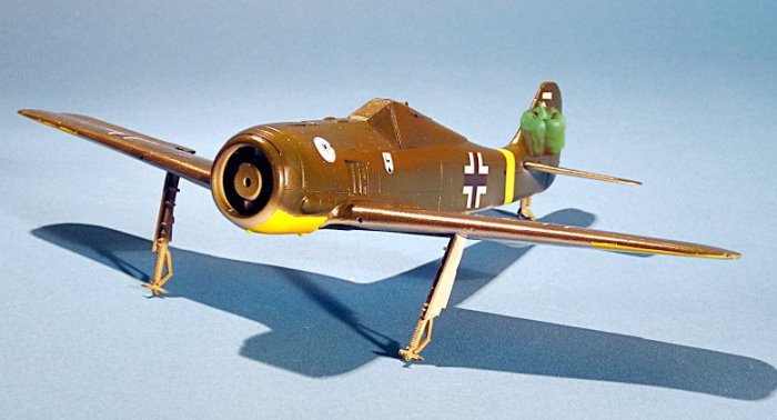 Nun ging es also an die Farbgebung. Vorbild für mein Modell ist die Fw 190 A-3 von Heinrich Krafft, wie sie 1942 ausgesehen hat. Vorbildfotos fand ich in Jagdfliegerverbände der Luftwaffe Band 9 Teilband II. Ich habe mich für eine gelbe Motorunterseite entschieden, weil sie auf einem Foto erkennbar war (auf einigen aber auch nicht) und sie der gängigen Praxis entspricht. Die Maschinen der Ostgeschwader wurden feldmäßig dunkel nachgetarnt, nach dem eben genannten Buch dunkel grün. Dies kann natürlich so gut wie jede vorhandene oder erbeutete Farbe sein. Ich entschied mich für RLM 71, da ich die warme Färbung mag und diese sicher auch gut zugänglich war.