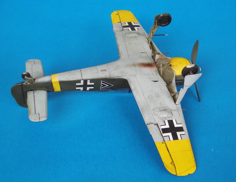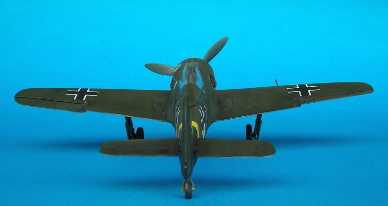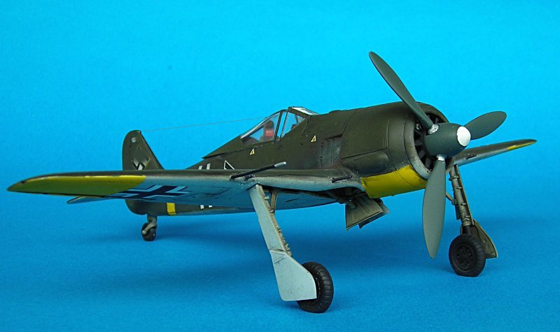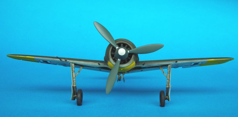 Die Passgenauigkeit am vorderen Rumpf-Flügel-Anschluss ist nicht optimal, hier muss man etwas herumprobieren, letztendlich ist dies jedoch keine große Hürde. Dummerweise habe ich zuerst den Motor angeklebt und wollte erst danach die Motorhaube, welche ich separat montiert hatte, anbringen. Dieser Fehler konnte aber durch ein paar Schnitzarbeiten behoben werden. Nachdem dann die Kanzel drauf war, habe ich das Fahrwerk montiert. Hierfür habe ich den Satz von Griffon verwandt. Der mehrteilige Aufbau der Spornradgabel ist sehr schön und wirkt VIEL besser, als das Hasegawa Teil. Leider ist jedoch das Resin nicht besonders stabil, und die Gabel verbiegt sich unter längerer Belastung. Die Räder des Satzes gefallen mir wiederum sehr gut.