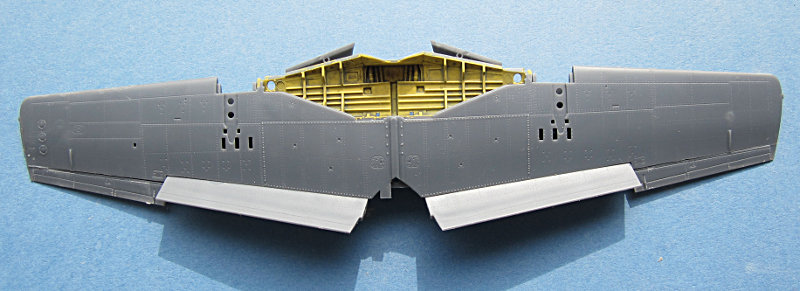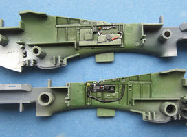 Da es sich um einen ausgestellten Bausatz handelt, gab es auch hier und da ein wenig Bruch, den ich nachbauen musste. Bis auf den Windschutz, den ich auch selbst beschädigt haben kann (siehe Probepassung oben), war dies aber nicht gravierend. Ein weiterer Nachteil des Konstruktionskonzeptes des Bausatzes ist das Gewicht. Die Teile sind überdurchschnittlich schwer, so dass das Modell insgesamt ein ganz schöner Brocken wird. Leider soll man die Fahrwerke frühzeitig einbauen, was sich beim Hauptfahrwerk mittels der Methode von Brett Green noch umgehen lässt. Das Spornrad ist aber bei mir irgendwann gebrochen, so dass ich das Bein durch eine Büroklammer ersetzen musste. Die Biegung ist zwar nicht spot-on, aber ich bin mit dem Ergebnis nicht unzufrieden.