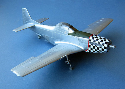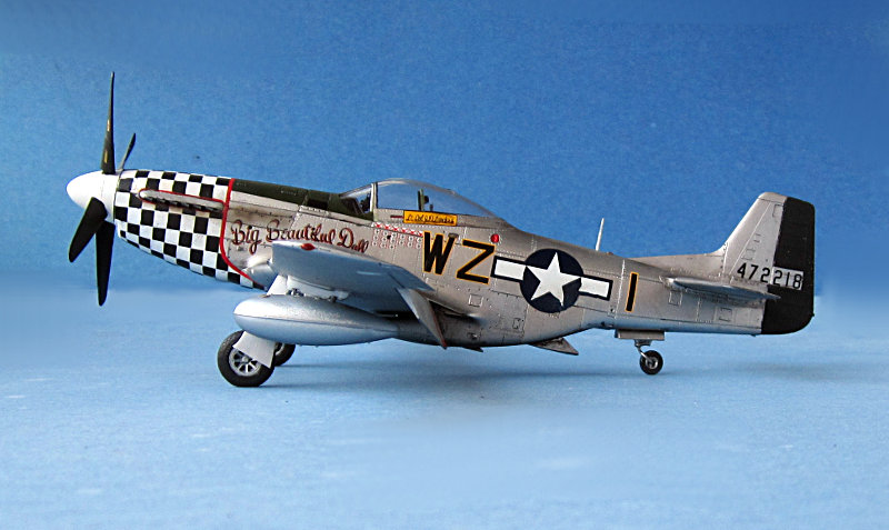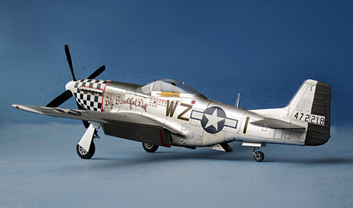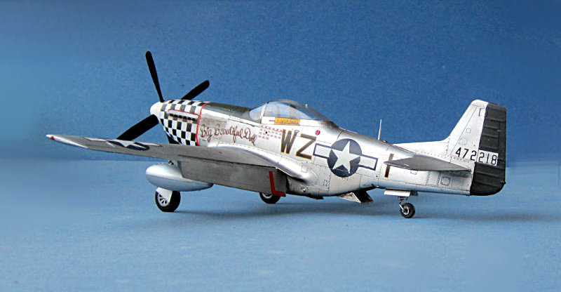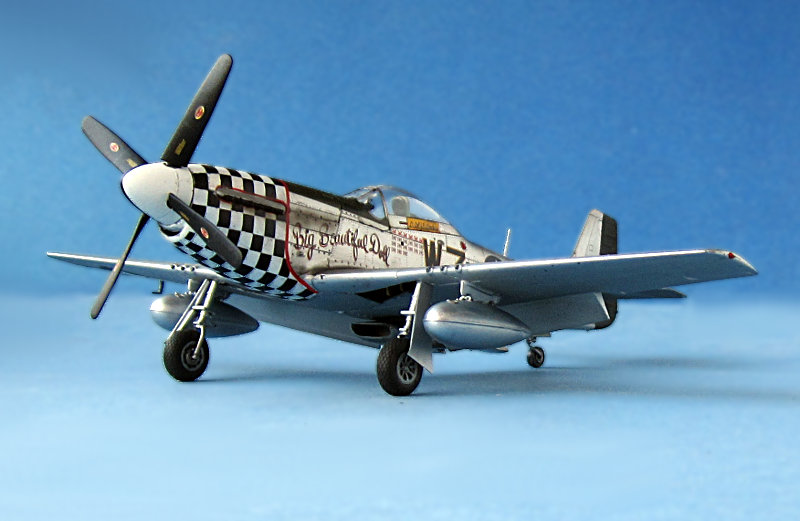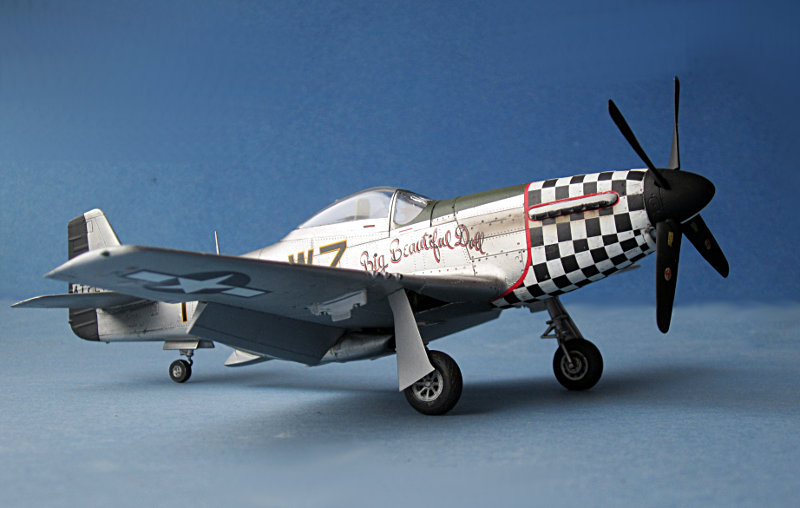 Da mir leider kein Decalbogen vorlag, musste ich auf den Zubehörmarkt ausweichen. Hier war das größte Problem, sich für eine Bemalungsvariante zu entscheiden. Als aber Lifelike einen ganzen Bogen mit Markierungen für John Landers‘ "Big Beautiful Doll" herausgebracht hatte, konnte ich mich recht schnell für eines dieser Vorbilder entscheiden. Im WWW habe ich auch einige Vorbildfotos der von mir gewählten Variante gefunden. Die Maschine hat ein deutliches Rautenprofil auf den Reifen, so dass hier die Brassin Räder von Eduard herhalten mussten, da mir das Profil der Bausatzreifen zu schwach war und ich es nicht geschafft habe dieses zu verbessern. Natürlich mussten die Räder für die Verwendung mit den Meng-Fahrwerksbeinen angepasst werden.