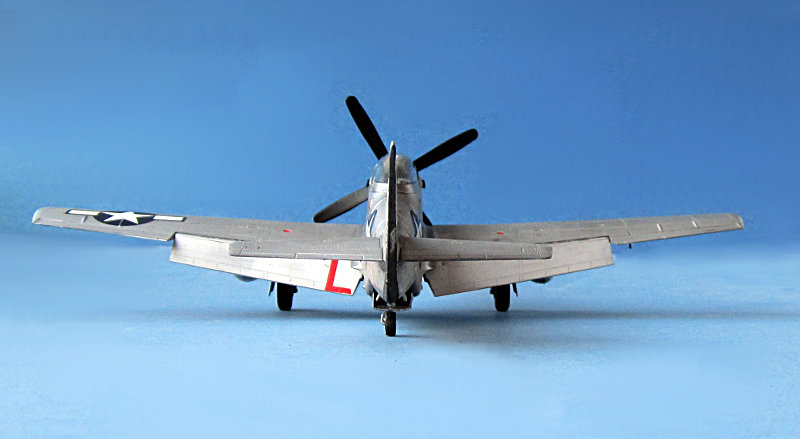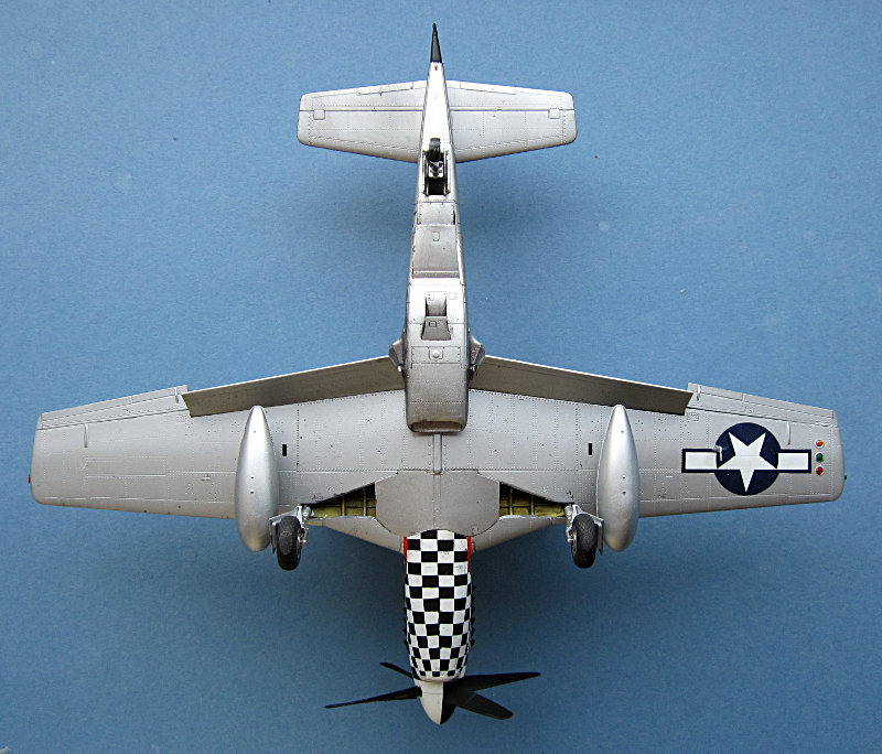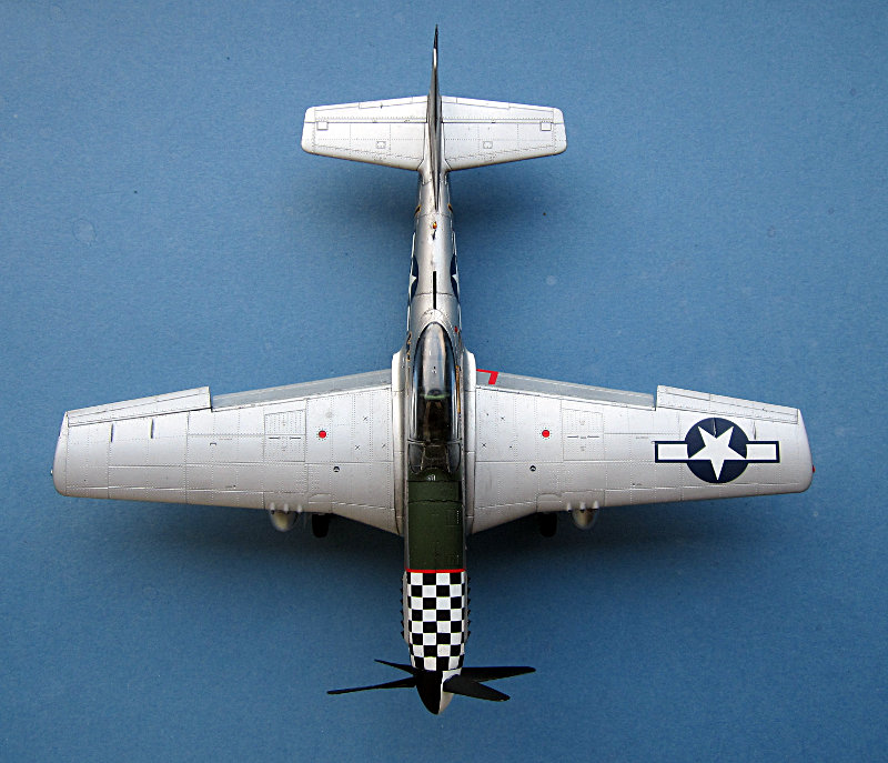 Die Farbgebung erfolgte mit verschiedenen Alu-Farbtönen. Die Flügel sind TS-30 von Tamiya (dekantiert und mit der Airbrush aufgetragen) hier habe ich auch auf ein späteres Wash verzichtet, immerhin waren die P-51 im Krieg gespachtelt und Alu lackiert. Beim Rumpf habe ich verschieden Töne aus dem Programm von AK Xtreme Metal getestet… und für gut befunden. Die Paneele hinter dem Auspuff wurden Dark Aluminium und die seitlich des Turboladers in Dural. Ansonsten habe ich auf große Abklebereien verzichtet und nur die Gravur mit einem dunklen Wash ausgelegt. Der Verbrauch ist übrigens nur unwesentlich geringer als bei Alclad II Farben.