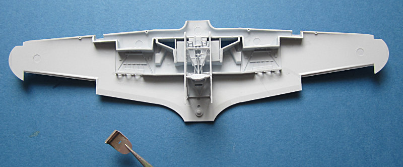 Wie erwähnt war die Passgenauigkeit der Holme nicht sehr gut. Durch die Zwingen wurde das Problem nicht vollständig behoben, so dass auch die Flügeloberseite nicht 100%ig passte. Einen Baufehler kann ich natürlich ebenfalls nicht ausschließen, aber vielleicht hatte ich auch einfach Pech mit dem Bausatz. Die Versäuberung der Flügelvorderkante blieb jedoch in einem erträglichen Rahmen. Die Cockpitseitenwände erhalten kaum zusätzliche Details. Auch die Kartentasche habe ich nicht ersetzt, sondern das Plastikteil lediglich braun bemalt, was bestimmt nicht ganz korrekt ist, aber für einen Farbtupfer sorgt.