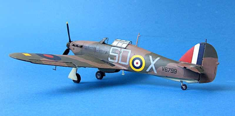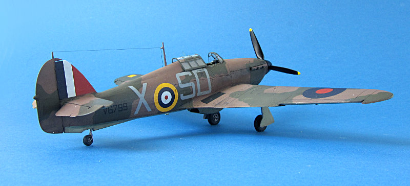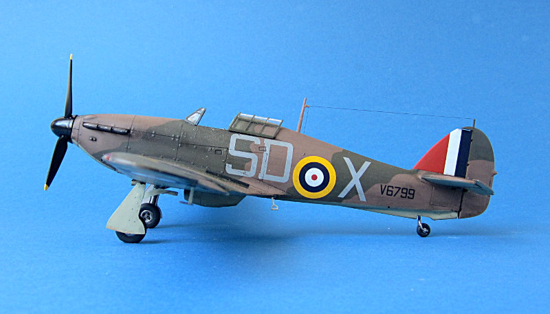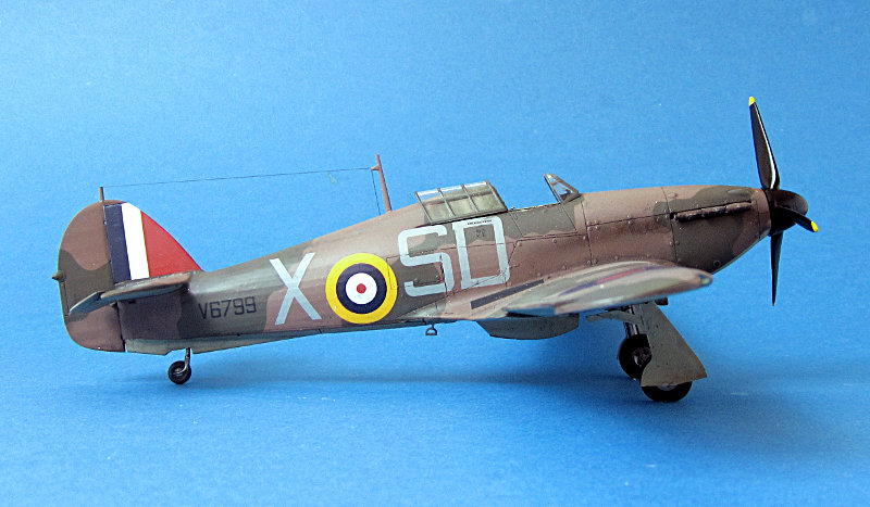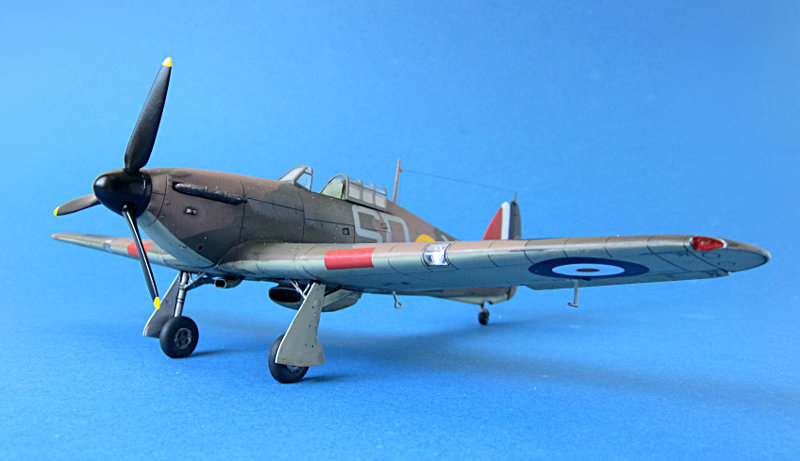 Und wieder ein Problem: Airfix gibt in der Bauanleitung das B-Scheme an. In meinem Hinterkopf hatte sich aber eingegraben, das Hurricanes mit ungerader Seriennummer, V6799 in diesem Fall, das A-Scheme trugen. Entsprechende Onlineanfragen in einschlägigen Foren ergaben dann ein "kann sein, muss aber nicht". Außerdem bekam ich noch ein paar Hinweise wie schlecht das Modell ist (siehe z.B. hier). Zum Glück konnte ich online ein Foto der notgelandeten Hurricane finden und mich anhand dessen für das A-Scheme entscheiden.