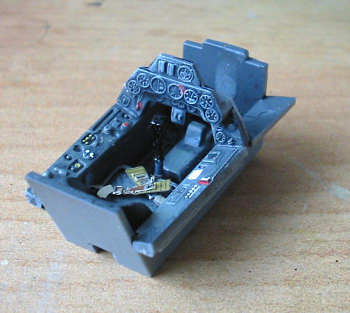 Los geht's wie immer mit dem Cockpit. Hier kommt es natürlich zur ersten Abweichung. Der Arbeitsplatz des Flugzeugführers ist zwar recht gut detailliert, es fehlen jedoch Gurte. Hierfür musste der Eduardsatz mit den bereits farbig bedruckten Jägergurten der Luftwaffe herhalten. Dies ist eine problemlose Ergänzung, die auch Modellbauanfänger vor keine allzugroßen Probleme stellen wird, jedoch eine erhebliche Aufwertung des Modells darstellt.