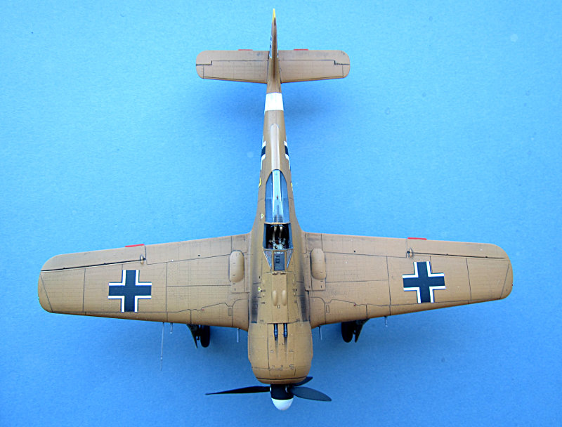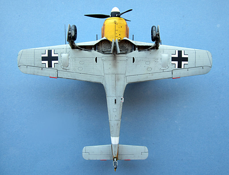 Doch zunächst zur Bemalung. Los ging es mit RLM 76 von Gunze, da das Vorbild eine vom Europaanstrich 74/75/76 umgetarnte Maschine war. Für die Lackierung habe ich mir übrigens eher an das Buch von Morten Jessen gehalten (Foto und Profile) als an die Bauanleitung. Für das RLM 04 nutzte ich ebenfalls die Farbe von Gunze, während ich für das RLM 79 auf JPS zurückgriff. Die Farbtöne von Jens Popp sind wirklich gut, allerdings lässt sich die Farbe nicht ganz so leicht verarbeiten, zumal meine Gebinde auch schon etwas älter sind. Nach einer Schicht Klear maskierte und lackierte ich das weiße Rumpfband. Analog verfuhr ich mit dem Fahrwerkschacht und den Hauptfahrwerksbeinen (Gunze RLM02).