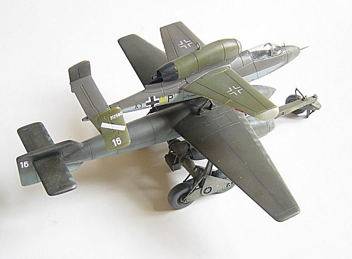 Hintergrundinformationen: Unter der Bezeichnung Mistel gab es gegen Ende des II Weltkrieges einige Kombinationen, in denen ein mit Sprengstoff geladenes Trägerflugzeug ein bemanntes Steuerflugzeug "Huckepack" trug. Die frühen Mistel-Projekten sahen die Me Bf 109 oder die Focke Wulf 190 kombiniert mit der Ju 88 vor. Dabei sollten die vom Jagdflugzeug aus gesteuerten Kombinationen ihre Reise bis zum Ziel antreten und die mit hochexplosiven Stoffen gefüllte Bombenkomponete vor dem Ziel ausgeklinkt werden und als Bombe die Einwegreise aus eigener Kraft fortsetzen.