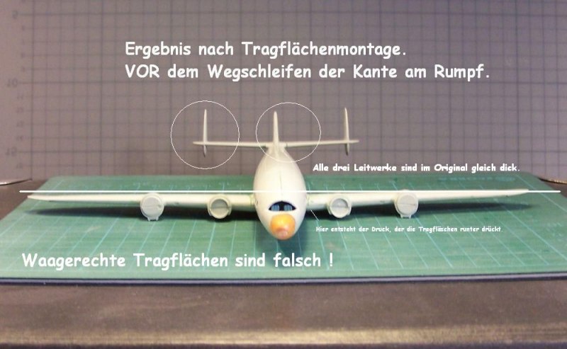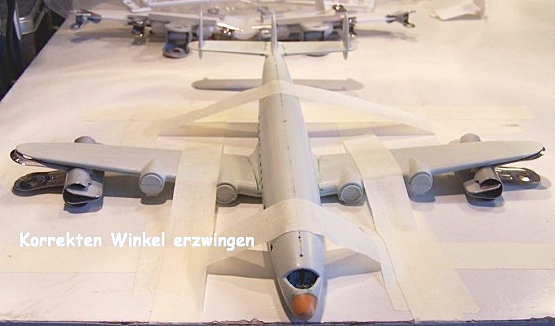 Für die Montage der Tragflächen unbedingt eine Stützkonstruktion bauen, um die Flügen weit genug nach oben zu biegen (siehe Teilevorbereitung), sonst erhält man waagerechte Flächen, was definitiv nicht dem Original entspricht.