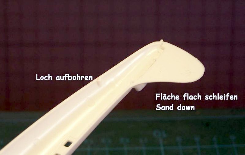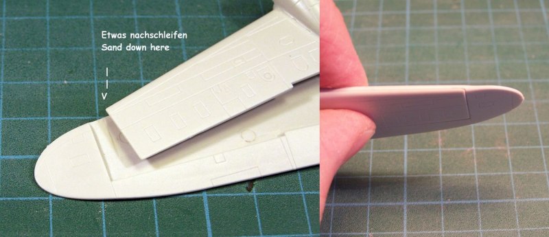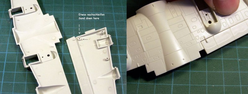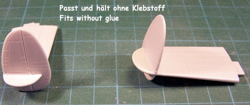 Der Dreizack am Heck, ich nenne ihn mal so, wartet mit einer besonderen Überraschung auf: Die Seitenleitwerke und die Tragflächenstummel haben einen wirklich perfekten Anschluss erhalten. (siehe Foto) Nach dem Entgraten der Teile schiebt man sie mit etwas Druck ineinander und das war es. Klebstoff ist eigentlich nicht nötig.