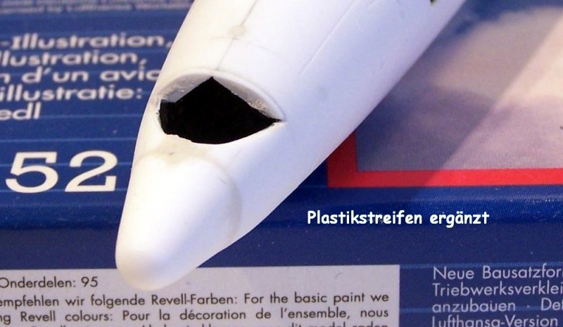 Die Nase der Lufthansa Conny muss mit Blau 52 vor dem "bedecaln" bemalt werden. Eine Überraschung gibt es dann beim Anbringen der Decals. Siehe unten !