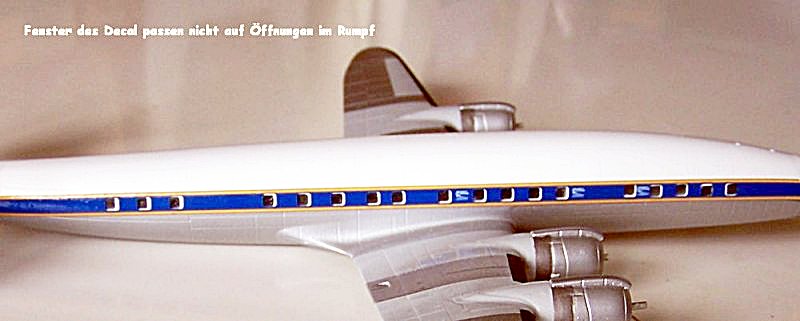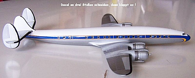 Lufthansa: Bei der Lufthansaversion unbedingt die blauen Streifen mit Liquid-Decal-Paper von Microscale bearbeiten, da die Fenster im Decal ausgeschnitten sind und beim Anfeuchten in Wasser zu einem echten Problem entwickeln. Ich habe das schon bei der DC-7C von Revell besprochen. Wenn man die Decals vom Papier schiebt verschiebt sich das Decal auch im Fensterbereich. Alles kann schräg werden und es ist sehr schwer das Decal sauber auszurichten.