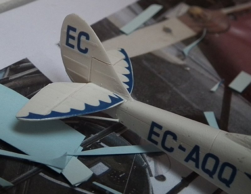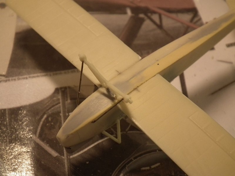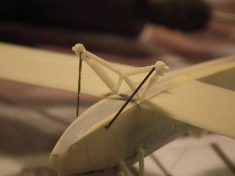 Vor der Montage der oberen Tragfläche wurden die Spanndrähte in die obere Tragfläche eingeklebt. Unten wurden kleine Drahtösen eingesetzt. Nach Tragflächenmontage konnte der Draht durch die Öse gefädelt und diese zum Spannschloss lang gezogen werden.