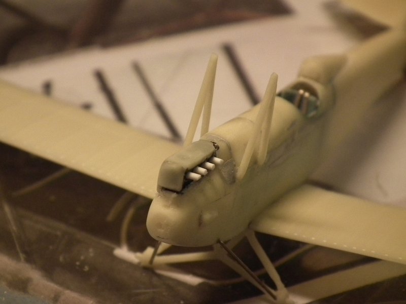 Die Cockpitdetailes sind recht spärlich. Glücklicherweise ist vom Innenraum nur recht wenig zu sehen. Dazu kommt noch, dass ich mich für die Variante mit nur einem Cockpit entschlossen habe. Bei meinem Modell wurden lediglich die Armaturen aufgemalt und ein Kompass eingebaut. Die Bodenplatte musste vorn um einige Millimeter gekürzt werden, damit die Inneneinrichtung korrekt zum Einstieg sitzt. Schlimmer war, dass der Sitz zu hoch ist, und dadurch die obere Abdeckung nicht passt. Ich musste den Sitz "tiefer legen" und oben etwas kürzen, und das alles nach der Bemalung.