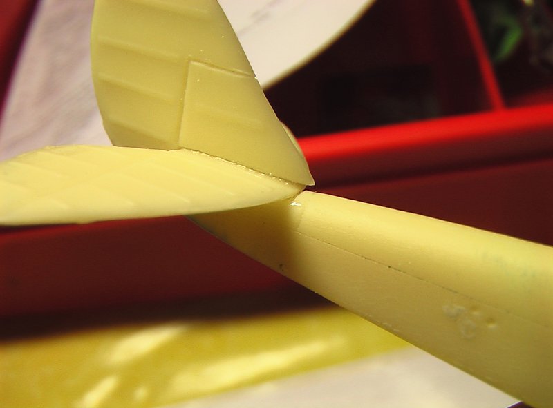 Auch am Seitenleitwerk musste stark nachgebessert werden. Die Kontur der aufsitzenden Fläche passt einfach nicht zu der Rumpf- Höhenleitwerksoberfläche. Ich habe die Spalte wieder mit Sekundenkleber und Natron gefüllt. Anschließend wurde das Leitwerk verschliffen.