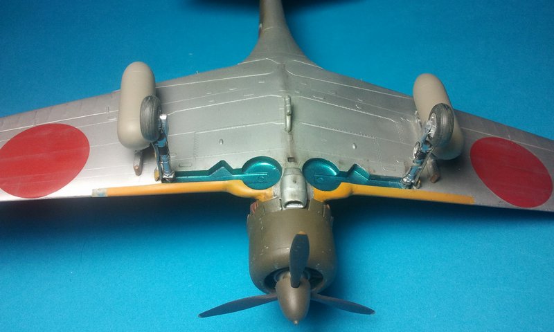 Den Innenraum habe ich in Aotake (Blaugrünmetallic H63 von Gunze) gesprüht, ebenso die Fahrwerksschächte. Die Unterseiten erhielten vorbildgerecht eine Lackierung mit H218 Aluminium von Gunze, die Oberseiten mit Olive Drab 1 (H52), die Identifizierungsstreifen an den Flügelvorderkanten entstanden mit H414 (RLM 23 Rot) plus H413 (RLM 04 Gelb). Das Olive Drab wurde mit einer Mischung aus weiß und gelb aufgehellt noch einmal auf die zentralen Bereiche der Beplankungsbleche fleckig aufgesprüht. Dann wurden zahlreiche Lack-Abplatzer mit einem silbernen Stift simuliert.