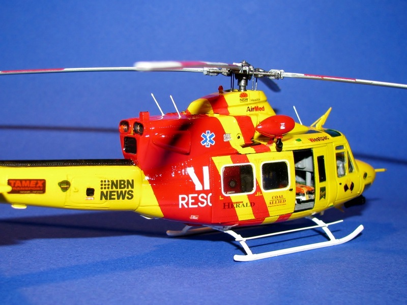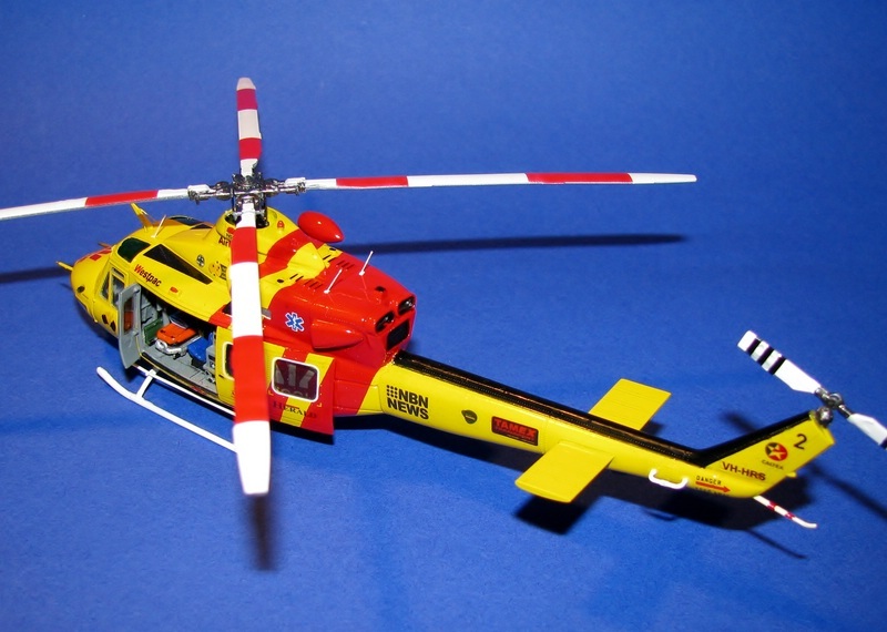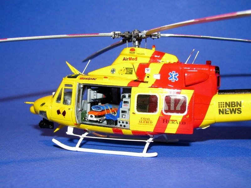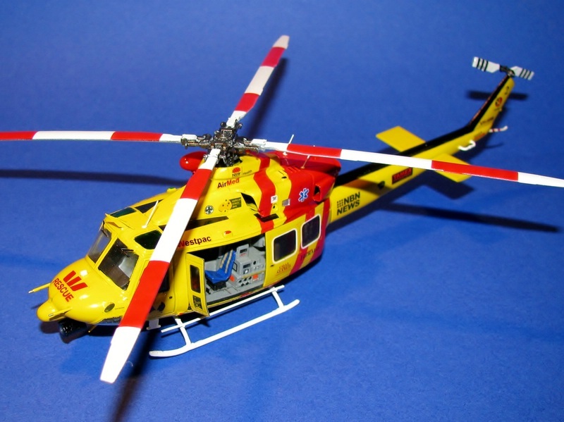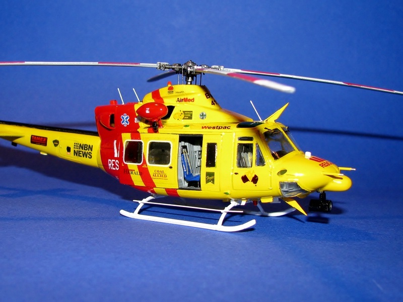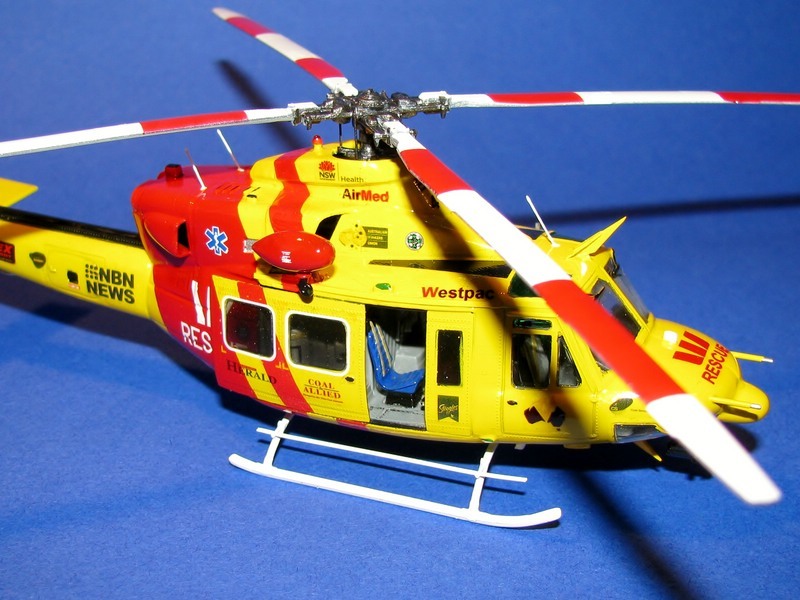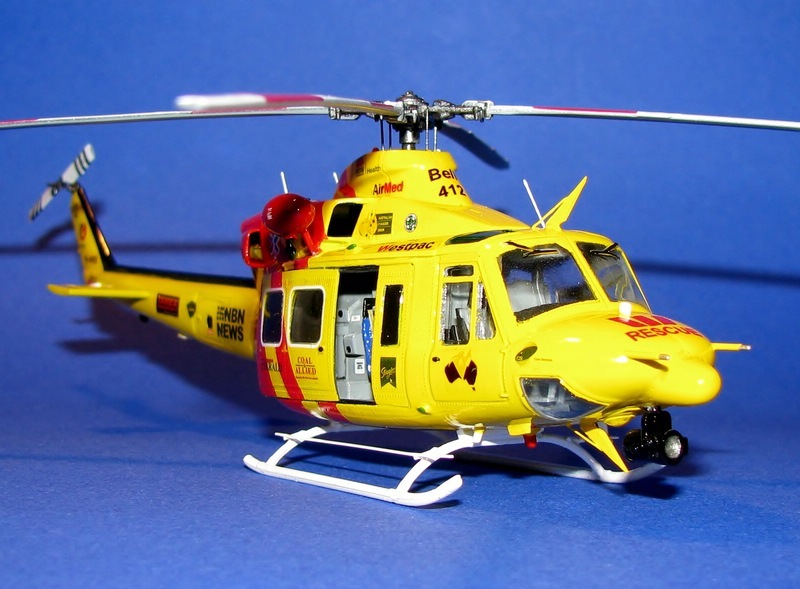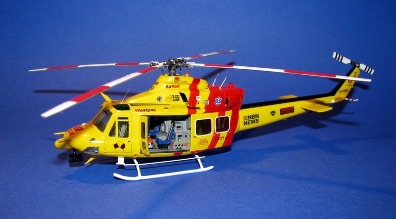 Das Modell der Bell 412 von Italeri in 1:72 hat schon einige Jahre auf dem Buckel, bildet aber immer noch eine gute Grundlage für ein schönes Modell. Meine Vorbildauswahl fiel auf eine Maschine von WestPac die in Australien mehrere Standorte mit Rettungshubschraubern betreiben, darunter auch das Muster Bell 412. WestPac hat seine Maschinen in einem extrem attraktiven, rot - gelbem, Farbkleid lackiert. Dazu kommen noch ettliche Logo`s die über die komplette Maschine verteilt sind und die Partner und Sponsoren von WestPac zeigen. So ein Heli sollte es werden.