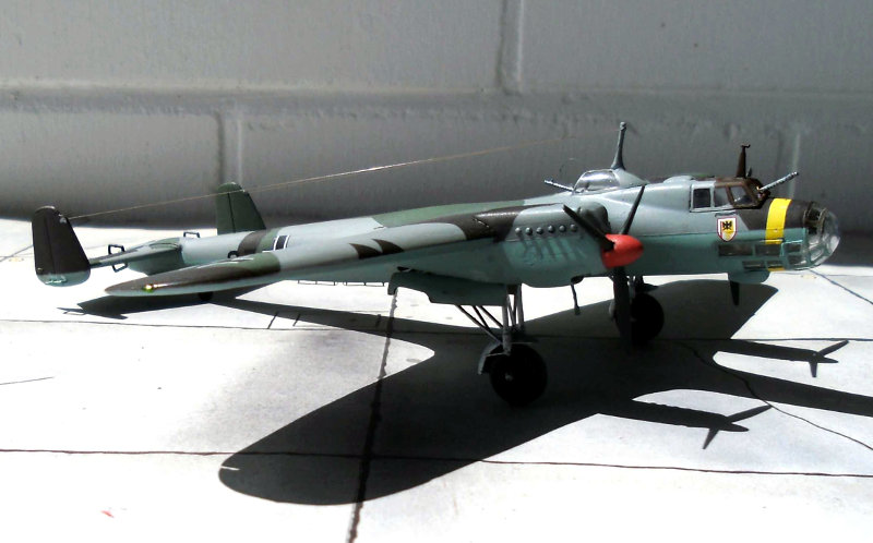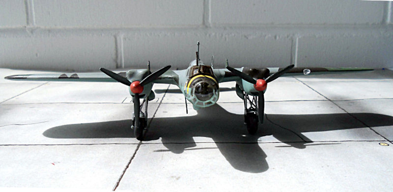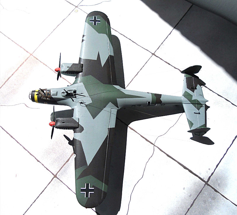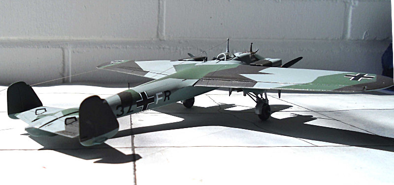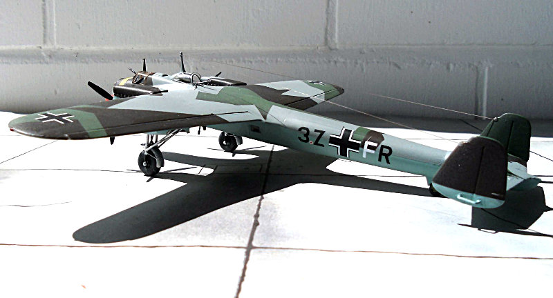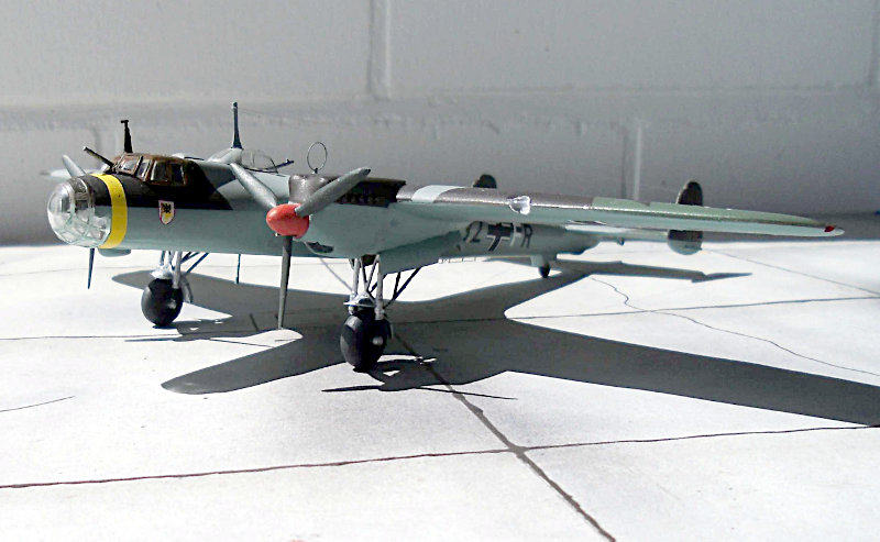 Farbgebung: Es gibt 4 Bemalungsvorschläge, farbig auf der Kartonrückseite. Ich habe mich für die Vorkriegsbemalung einer Maschine der I./KG 77 entschieden. Die 4-Farben-Tarnung erfordert etwas Mehrarbeit. Die Unterseite in RLM 65, kein Problem. Die zweite Farbe auf der Oberseite RLM 63, ein helles Grau, auch kein Problem, man muss ja nur zum RLM 65, hellblau, abkleben. Die dritte Farbe auf der Oberseite RLM 62, ein dunkleres Grün, erfordert eine Menge Abklebearbeit. Ebenso die vierte Farbe RLM 61, ein Schokoladenbraun.