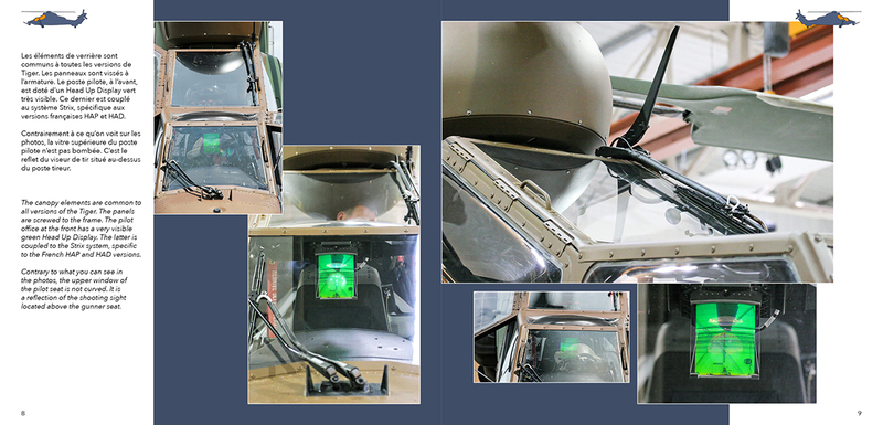 Das französische Modelbaumagazin Cocardes International beginnt mit diesem Band eine Reihe hochwertiger Foto-Monografien zu französischen Vorbildern (zumindest sieht es derzeit danach aus). Die Haptik und Optik ist ähnlich der Titel von Duke Hawkins das Format aber etwas größer. Zielgruppe ist hier eher der Modellbauer, denn es gibt viele Detailfotos. Manchmal ist es nicht ganz einfach sofort herauszufinden, wo sich das jeweilige Detail befindet, aber fast immer ist dann auf der Folgeseite eine Orientierung aus einem anderen Blickwinkel möglich. Die Fotos sind groß und scharf, der Text knapp und zweisprachig französisch/englisch. Dieser erste Band befasst sich mit dem französischen EC665 HAD/HAP Tigre, insofern ist der Titel etwas irreführend. Allerdings ist die internationale Bezeichnung Tiger. Zm Vergleich gibt es auch einige (wenige) Fotos des deutschen EC665 UHT.