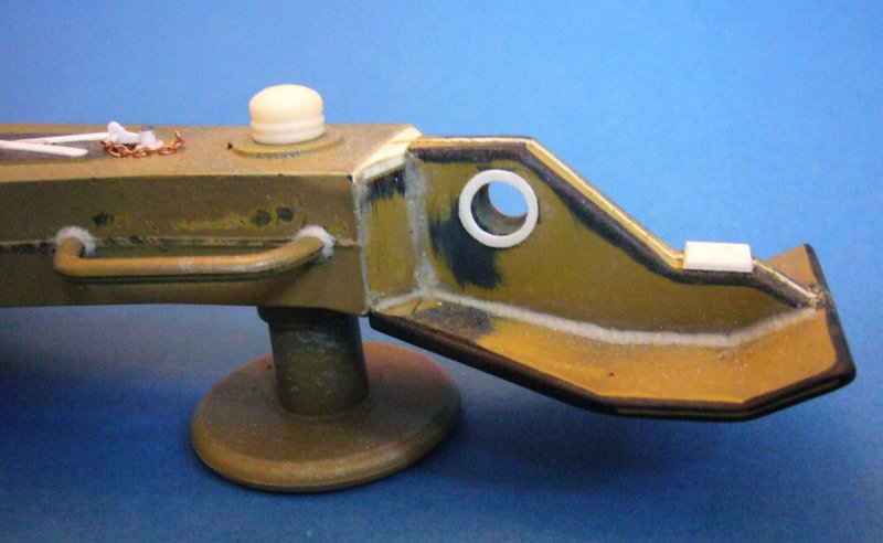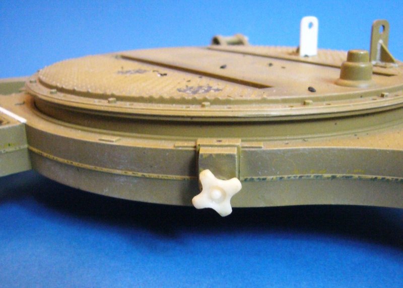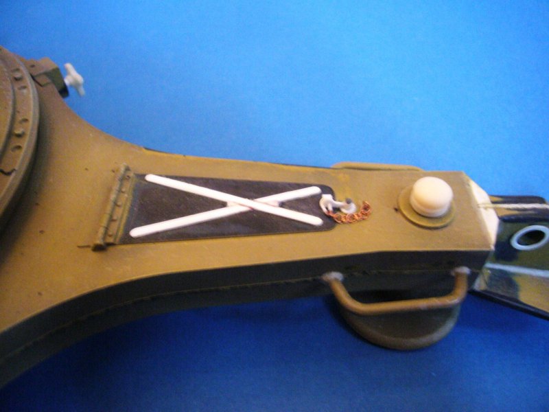 Die Abbildung zeigt zusätzliche Details an der Abdeckung des Werkzeugkastens, die im Modell nicht zu finden sind Ich habe zunächst die falsch dargestellte Rippenversteifung vollständig abgeschliffen und diese entsprechend Vorlage neu aus Plastikprofilen neu erstellt. Daneben wurde das Scharnier des Deckels durch Einkerbungen überarbeitet und an den beiden Enden kleine ausgestanzte Scheibchen angeklebt um die Scharnierstange darzustellen. Abschließend habe ich die einseitige Flügelmutter mit Arrettierstift und Kettchen nachgebildet und gemäß Vorbild ergänzt.