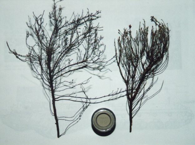 Bei unseren letzten Urlauben haben sowohl Christian als auch ich jeweils eine Pflanze entdeckt, die man zur realistischen Gestaltung von Bäumen in den gängigen Modellbaumaßstäben verwenden kann. Warum immer nur den teuren Meerschaum im Modelleisenbahnladen kaufen, wenn es auch so möglich ist, preiswert oder einfach mal anders Vegetation zu gestalten. Die entsprechenden Blätter kann man z.B. aus gerebelter Petersilie herstellen, die mit verdünntem Weißleim auf den Ästchen befestigt wird.