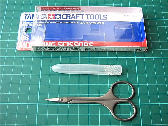 Als zweites neues Werkzeug kommt eine Schere zum Abtrennen bzw. Säubern von Fotoätzteilen von TAMIYA heraus. Da das Abtrennen der kleinen Teile von der geätzten Platine doch etwas problematisch ist, würde ich diese Schere dafür nicht unbedingt nehmen (es besteht Gefahr durch verbiegen der Teile nach dem Schnitt!). Besser ist es die kleinen Teile mit einer scharfen Klinge aus der Platine zu lösen, aber da doch meist ein winziger Grat am Ätzteil bleibt, kommt jetzt die neue Schere zum Einsatz!